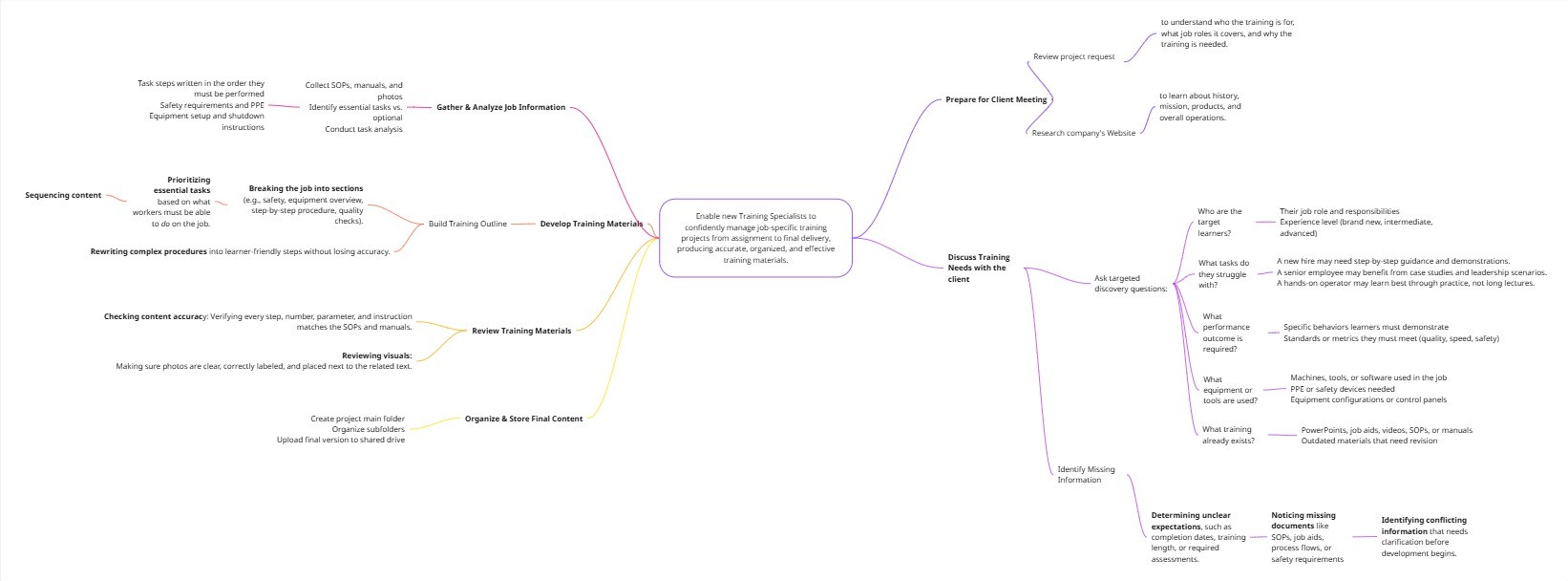 To address the problem, I combined my own experience developing job-specific training with insights from transitioning into a new role and feedback from the Training Manager. In my work as a training specialist, I consistently observed challenges among new specialists—including misunderstanding company needs, miscommunication with SMEs, reliance on technical jargon, and the creation of text-heavy presentations with limited visuals or interaction. At times, training was developed without a full understanding of key process details, leading to rework and delays.
